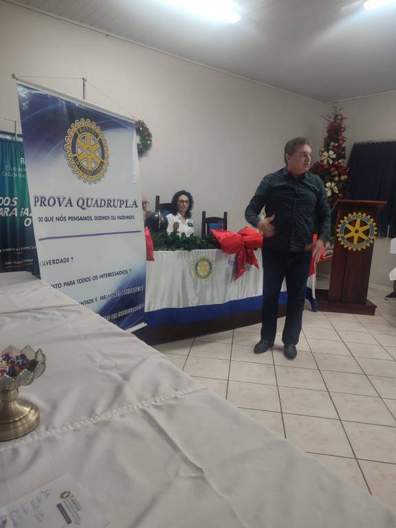 Durante a cerimônia, o companheiro Aristides Brandão Filho, primeiro presidente do clube e Governador Indicado para 2027-2028, conduziu uma reflexão sobre a Prova Quádrupla, um dos pilares éticos mais importantes do Rotary.